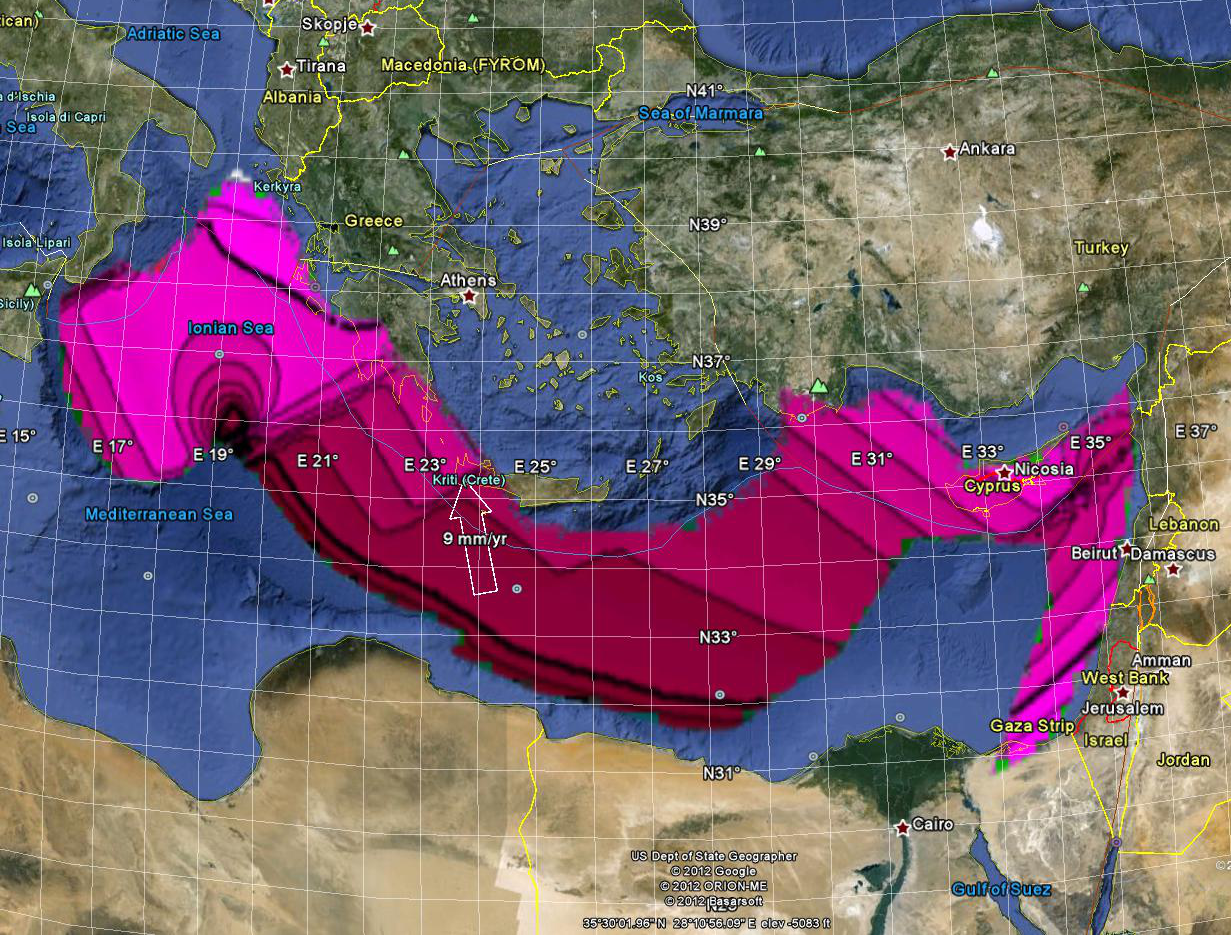 In the Mediterranean Sea the dark isochron near the bottom of the deep purple is 270 million years old and the dark isochron in the lighter purple at the top and to the far right is 240 mya. This remnant spans the great Permian Extinction.