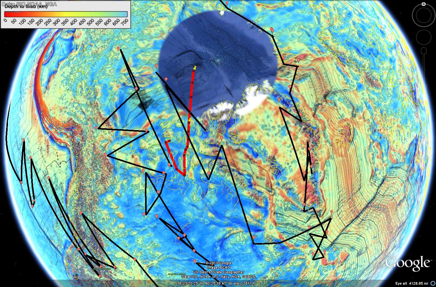 The black path is from Dr. Nowaczyk’s Black Sea data. The view is centered on the Canadian Arctic and the red path is Magnetic North since A.D. 1600 according to NOAA. I’ve discovered a lot more Ocean Drilling Project data for excursions I intend to create Fusion Tables for and plot in Google Earth as time and patience allows.