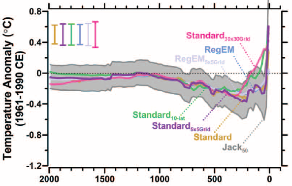 The graph above was recently published by Shaun Marcott et al in Science Magazine. It is a graph showing world temperature as recorded by some “proxies”, 18O in the shells of sea critters and such, for the past 2000 years. It involved some heavy statistical techniques and it seems to show a dramatic spike recently.