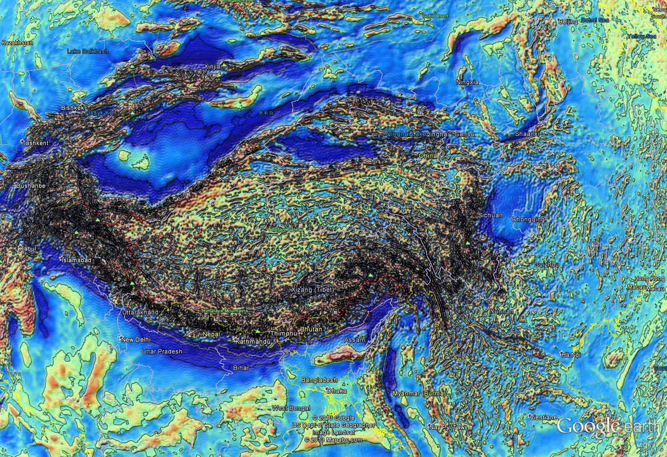 It is nearly heresy to suggest extension here, and indeed the compressional areas are very clear, reading as black. Nevertheless, the plateau and large areas of Malaysia and Southern China show the distinctive pattern.