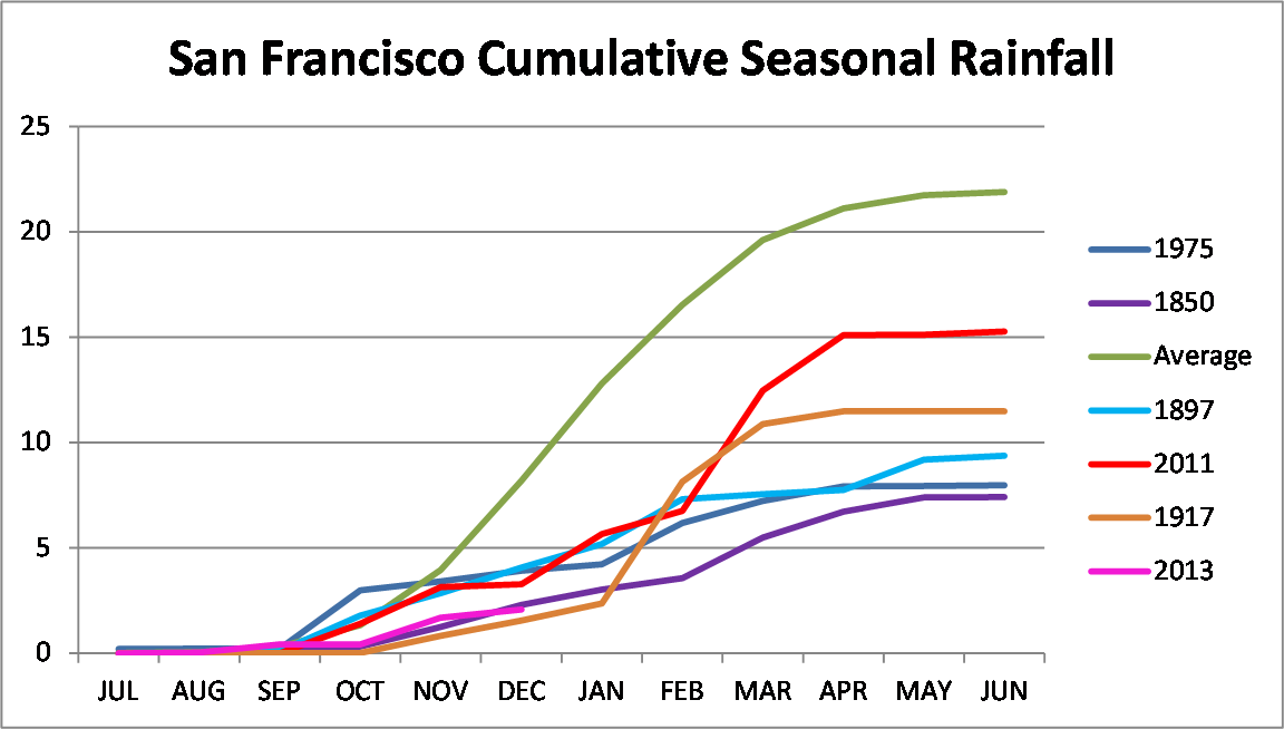 As you can see the 2013-2014 season is on track with the driest two previous years. It is tracking almost perfectly with 1850, much as 2011 tracked with 1897 until February. The driest year through December remains 1917.