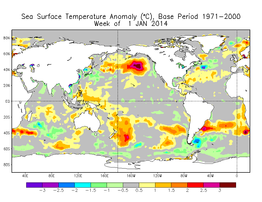 This is a six month sea surface animation beginning in August, 2013. We can see that there is an unusual amount of extremely cold water upwelling off Baja California beginning in August and extending north during the “winter” months. The fish love this because it brings up lots of nutrients including Carbon from the deep ocean, but this pattern removes the areas of warm surface water that fatten the clouds with rain.