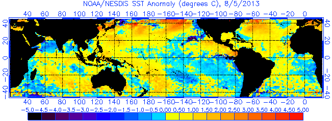 You can see this “hot spot” of ocean temperature in the previous animation but it shows better in this projection. For perverse reasons only NOAA would know, this animation will not run. In various configurations this has been around since August.