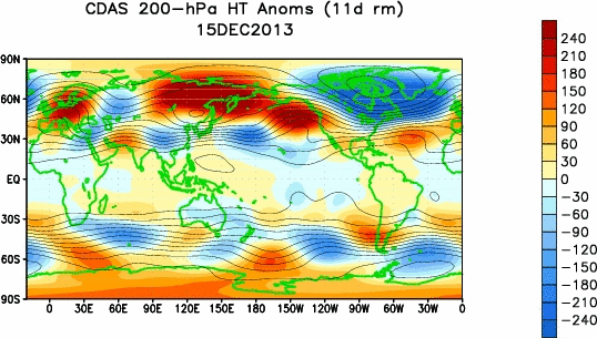 This animation is from 12000 meters at the very top of the atmosphere and the bottom of the stratosphere. Essentially, we are looking at areas of warm air rising and “denting” the bottom of the stratosphere and “sinkholes” where the stratosphere is warping down. One such downwarp can be seen causing the misnamed “polar vortex” that caused the recent cold wave back east.