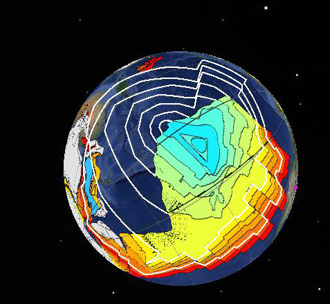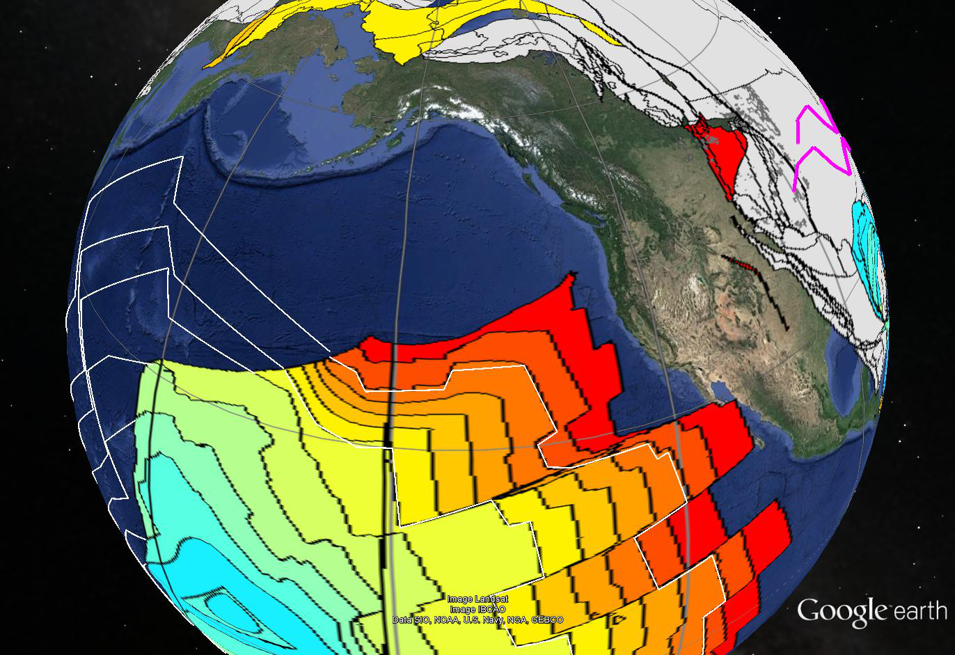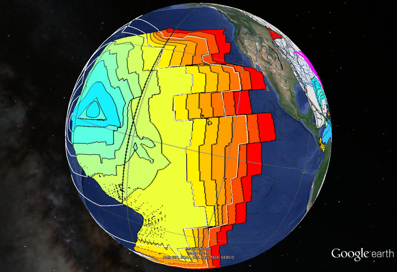 This is an image from the kml file for 60 mya based on work by Christopher Scotese. We decided to play a little game of “fill in the isochron”. The brightly colored areas are existing ocean floor with existing isochrons wee can drill and measure. The grey colors are continents as of 60 mya. The dark blue is windows into the Google Earth imagery where ocean floor has been lost. The white lines are our efforts of pure speculation, but we tried to match features suggested by remnants.