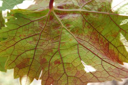 What seems to distinguish red blotch symptoms from Potassium and Phosphorus deficiencies, mite damage, and leafroll virus–all of which produce red leaves–is the reddening of the veins in the leaf. Sometimes this reddening of the veins is not apparent from the top and the leaf must be turned over like this one.