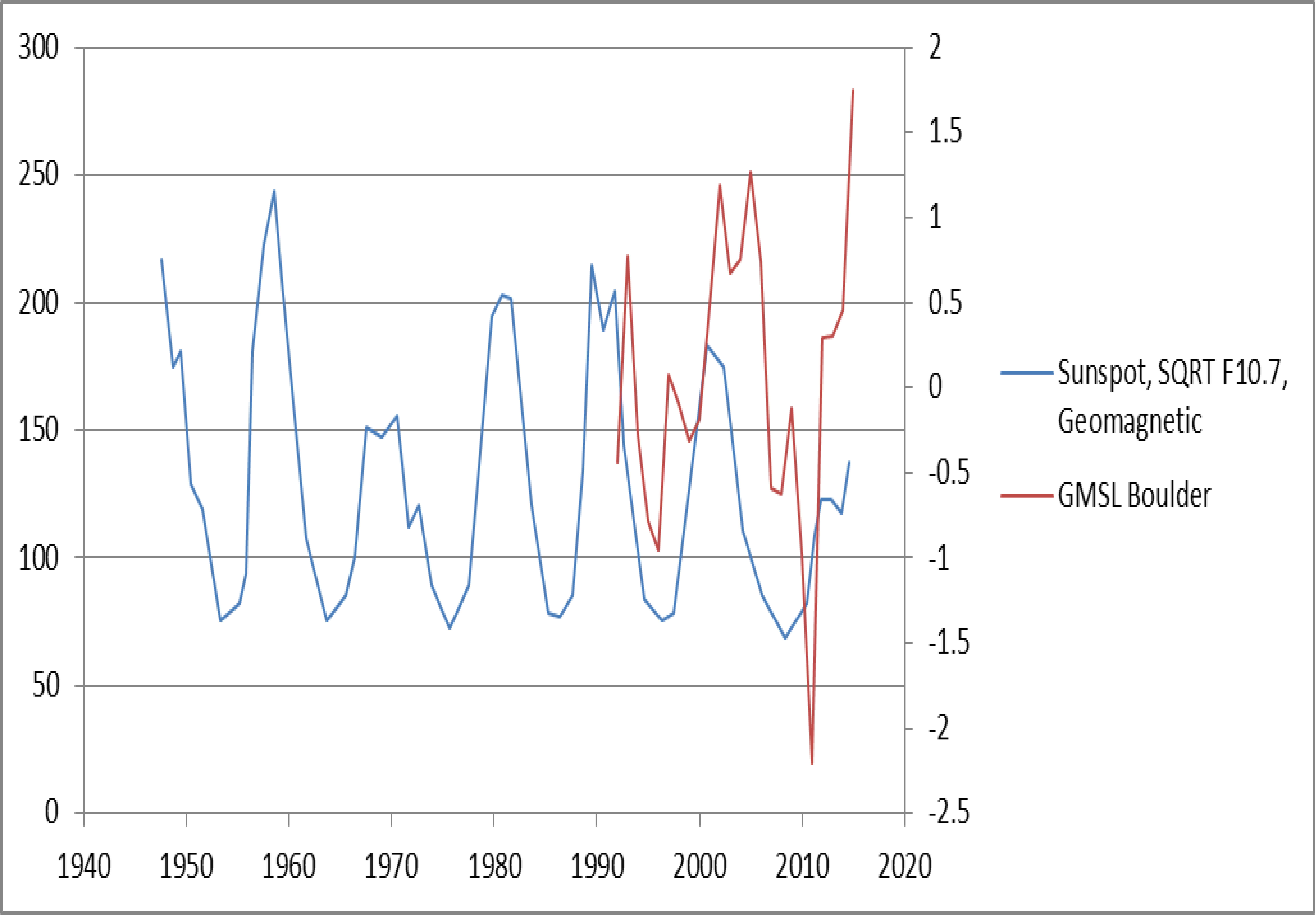 David Archibald proposes per the graphic above that the Solar Cycle controls sea level. Well, there seems to be a relationship all right but he is using the derivative rate of change for sea level rather than the actual levels and one might conclude that the sea level rate of change leads the solar cycle much of the time.