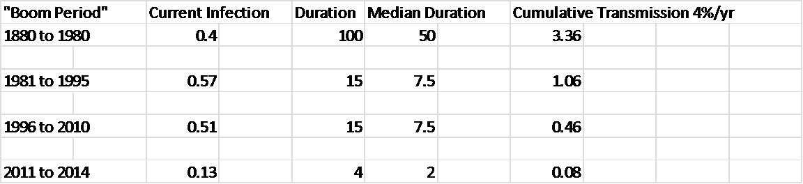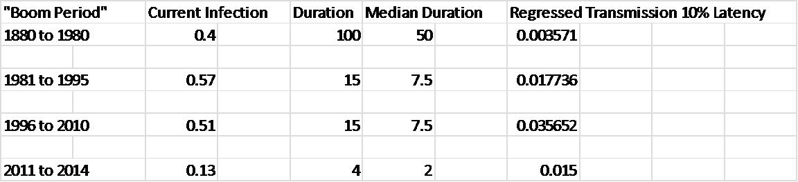 It can be seen that either the rate of infected planting or the rate of transmission, or both, was substantially higher in the 1996 to 2010 boom. Something fundamental happened then, but something else fundamental must have happened in about 2008 to bring about the recent explosion of symptoms.