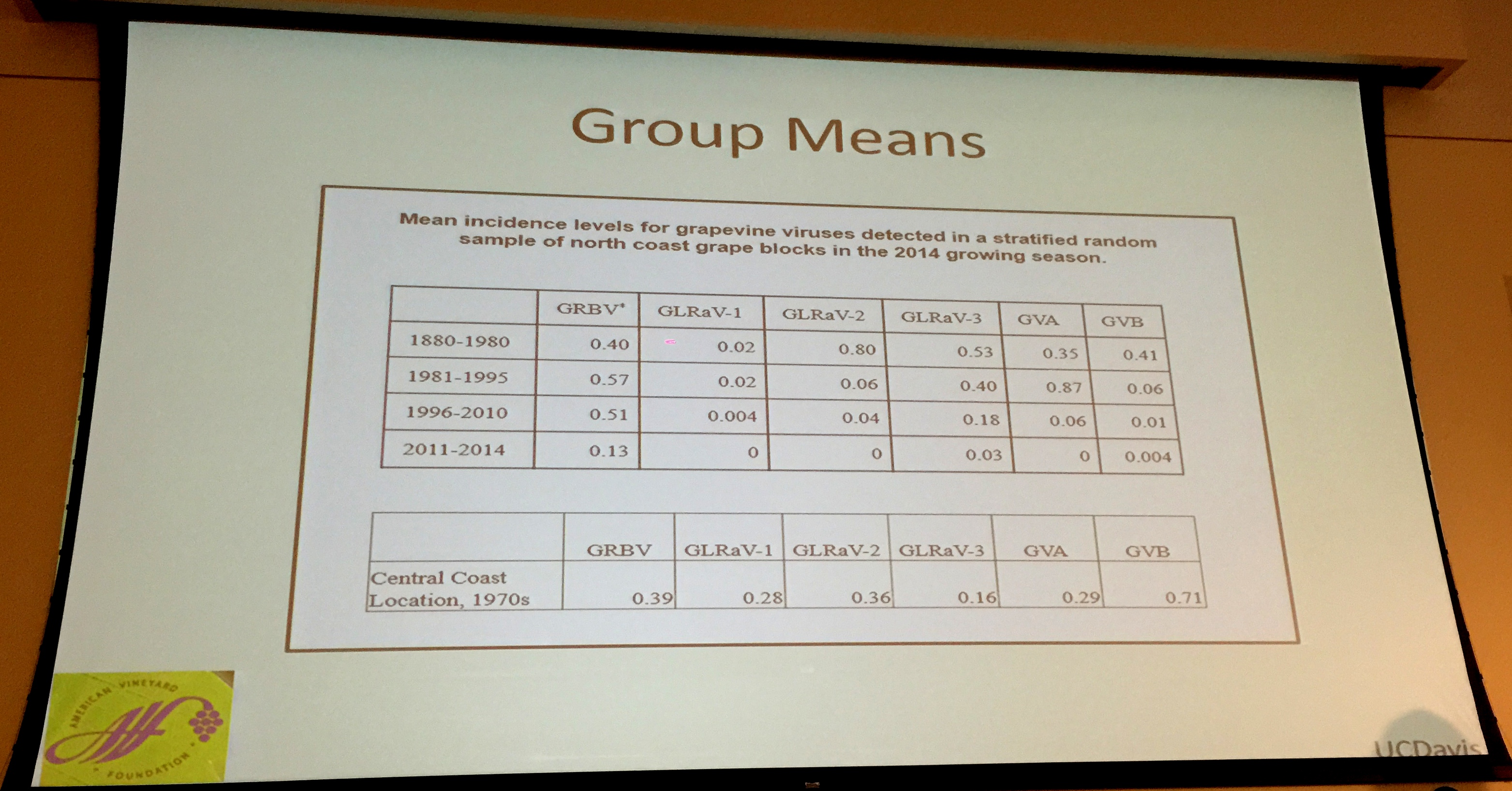 She uses the latest acronym GRBV in the first column for blotch because Koch’s postulates have been fulfilled and the disease is no longer merely “associated” with the virus. There is no way to know if these infections were latent in the planted stock or subsequently spread to them, but it is interesting that oldest period that spans one hundred years has a lower current incidence than the two fifteen year planting booms that followed. You would expect much higher incidence in the oldest period from accumulated transmission if transmission were efficient.