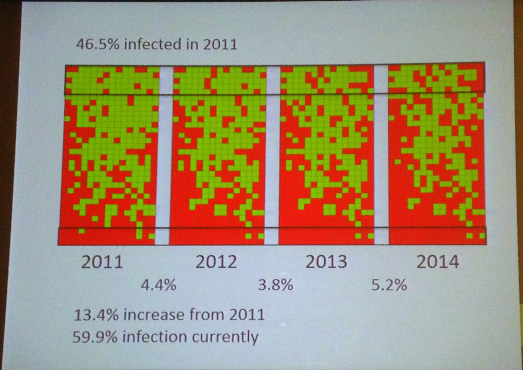 Assuming zero transmission, about half of the vines planted before 2011 were planted infected.
