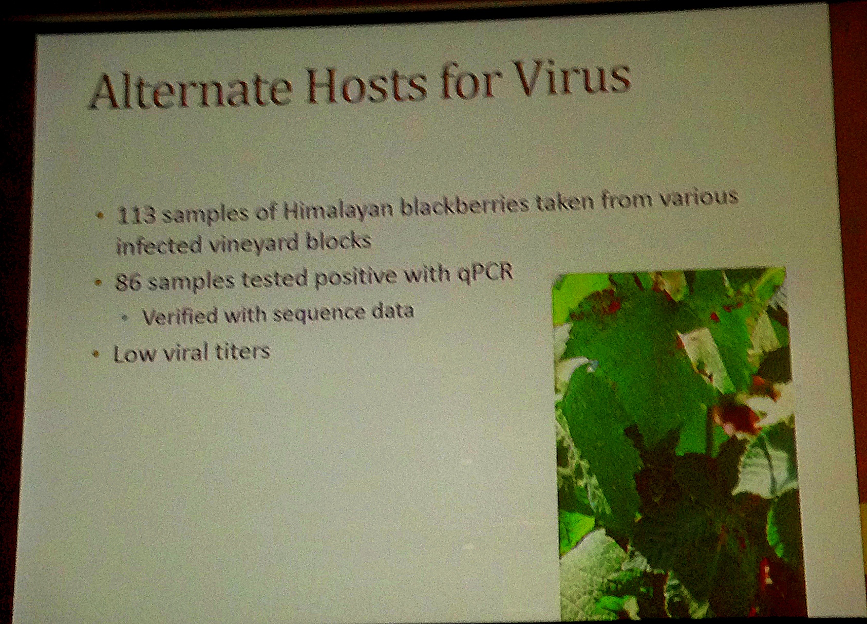 Brian Bahder found GRBaV in both wild grapes and blackberries in 2014, although the blackberries tested negative in the winter dormant period.