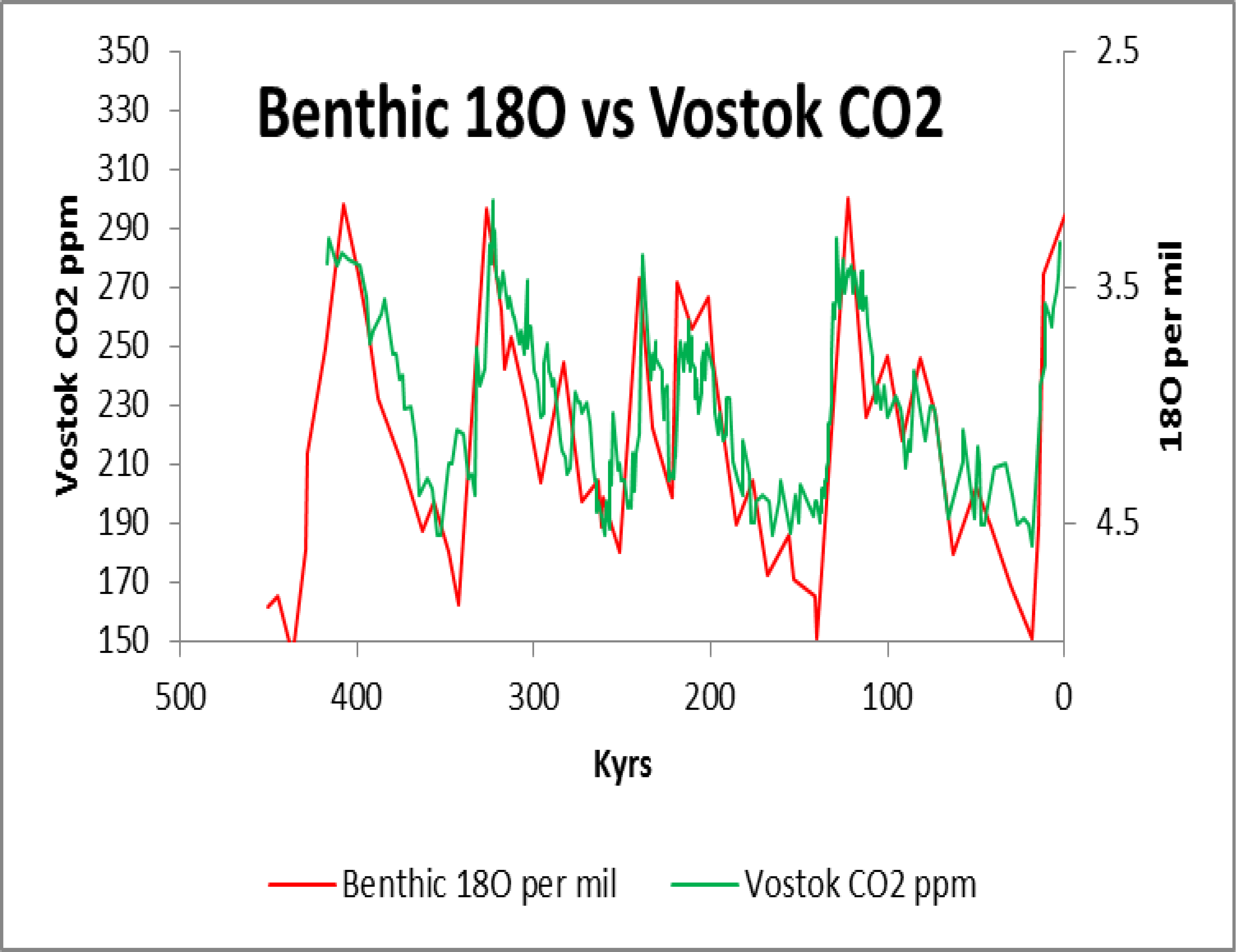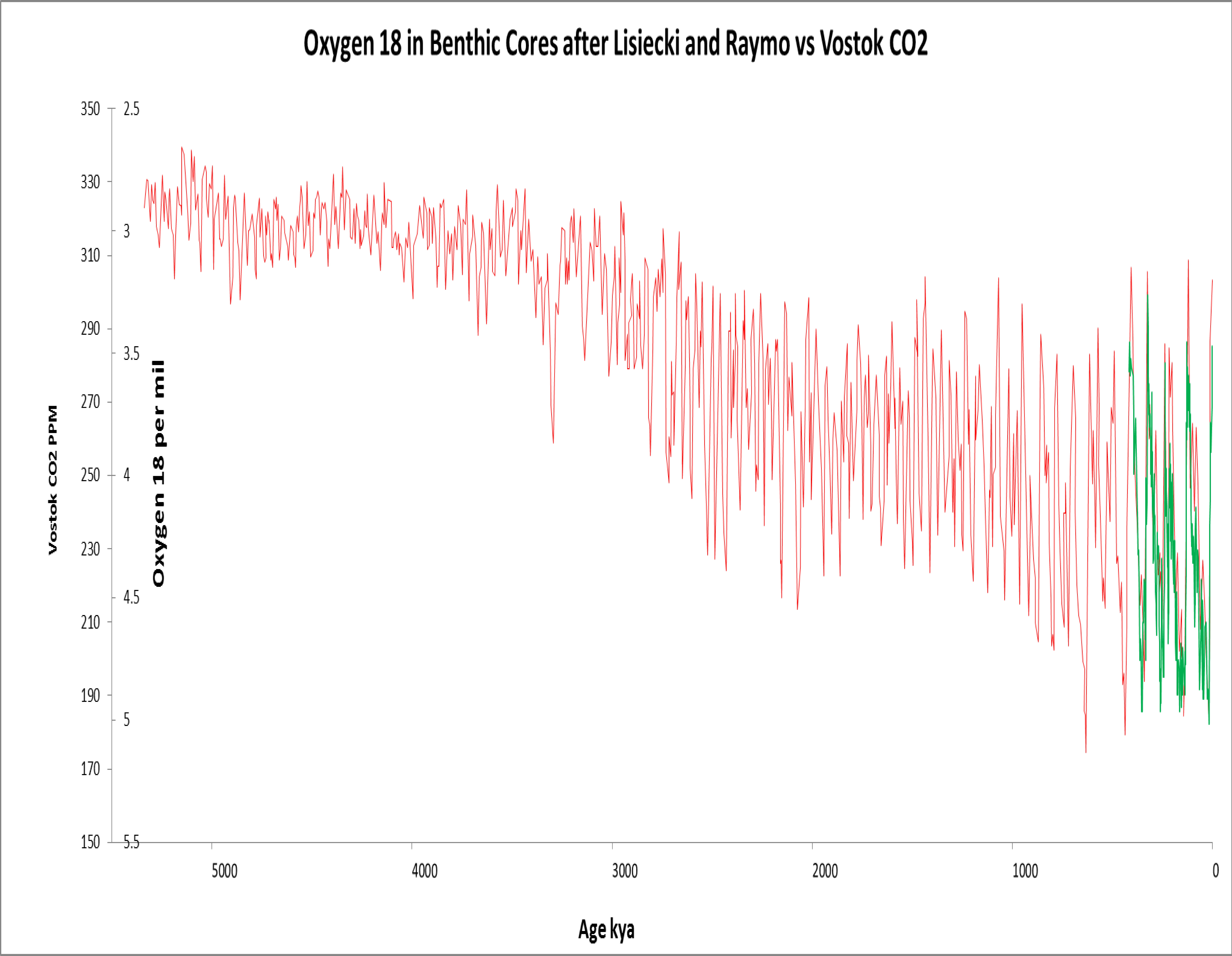 Things change when we zoom in to the scale of 5 million years as the planet descended into current ice age, the Pleistocene. It is well known that temperature drives CO2 in the ice core data. There is also temperature data from 18 Oxygen from the Ocean Drilling Project that goes back much further. In the graphic above the 400 thousand years of Vostok CO2 is plotted against the 18O series and the agreement is very good! There is good reason to suspect that the same relationship goes back 5 million years.