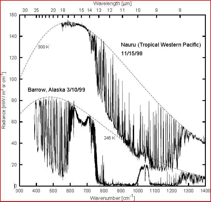 In the CO2 bands around wave number 667 a spectrometer pointed up from the ground sees radiation at very near surface temperature. In the cases above that near surface temperature was about 245  K in Barrow and 300 K at Nauru. The spectra are very different in form as a result of different humidities in the atmospheric window and ozone bands to the right. In the cold, dry air at Barrow the instrument reads near zero except for the ozone bands. Those photons are running away straight to space and there is nothing to see. In the warm, moist air of Nauru the window is very “dirty” and noisy due to scatter and radiation by water.