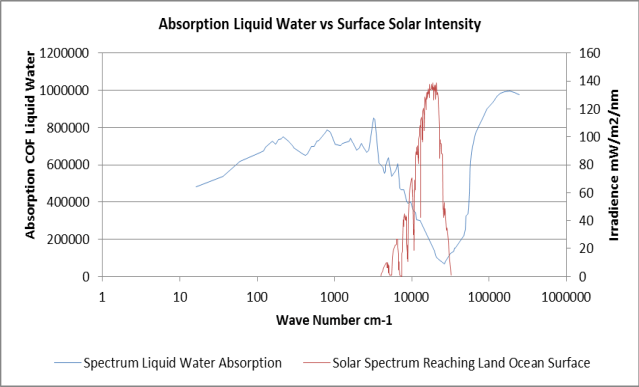 Even after all the atmospheric absorption and reflection from clouds, over half of the incoming solar SW makes it to the surface. Something like 7% is reflected from the surface, leaving just less than half absorbed by the surface. The surface is warmed, and radiates longwave out. Seventy percent of the surface is water, but as the graphic above shows, the shortwave absorption by water is at its lowest at the peak intensity of solar SW radiation.