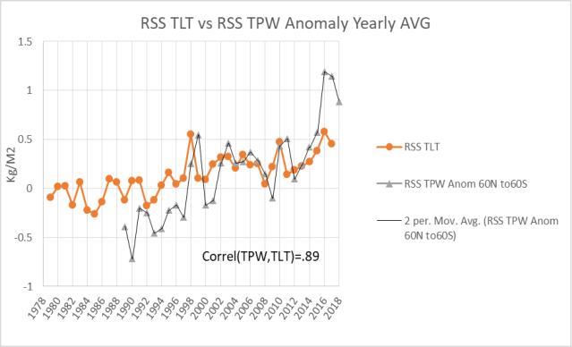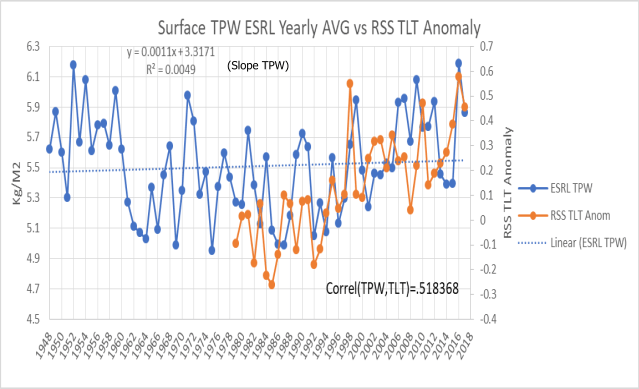 In the graphic above this TPW series is compared with RSS satellite lower troposphere (TLT) data. The correlation is not impressive, but there is reasonable agreement.