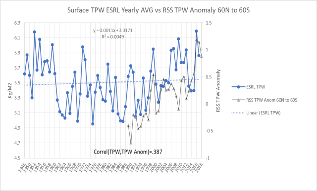 RSS has its own shorter TPW time series that excludes polar regions, and it is compared with ESRL TPW above. The correlation is poor, as will result from the trends being inverse from 1989 to 1997; but once again there is reasonable agreement. The burning question is what the satellites would have seen between 1948 and 1988. A reasonable supposition is that they would have generally tracked ESRL, with a poor correlation.