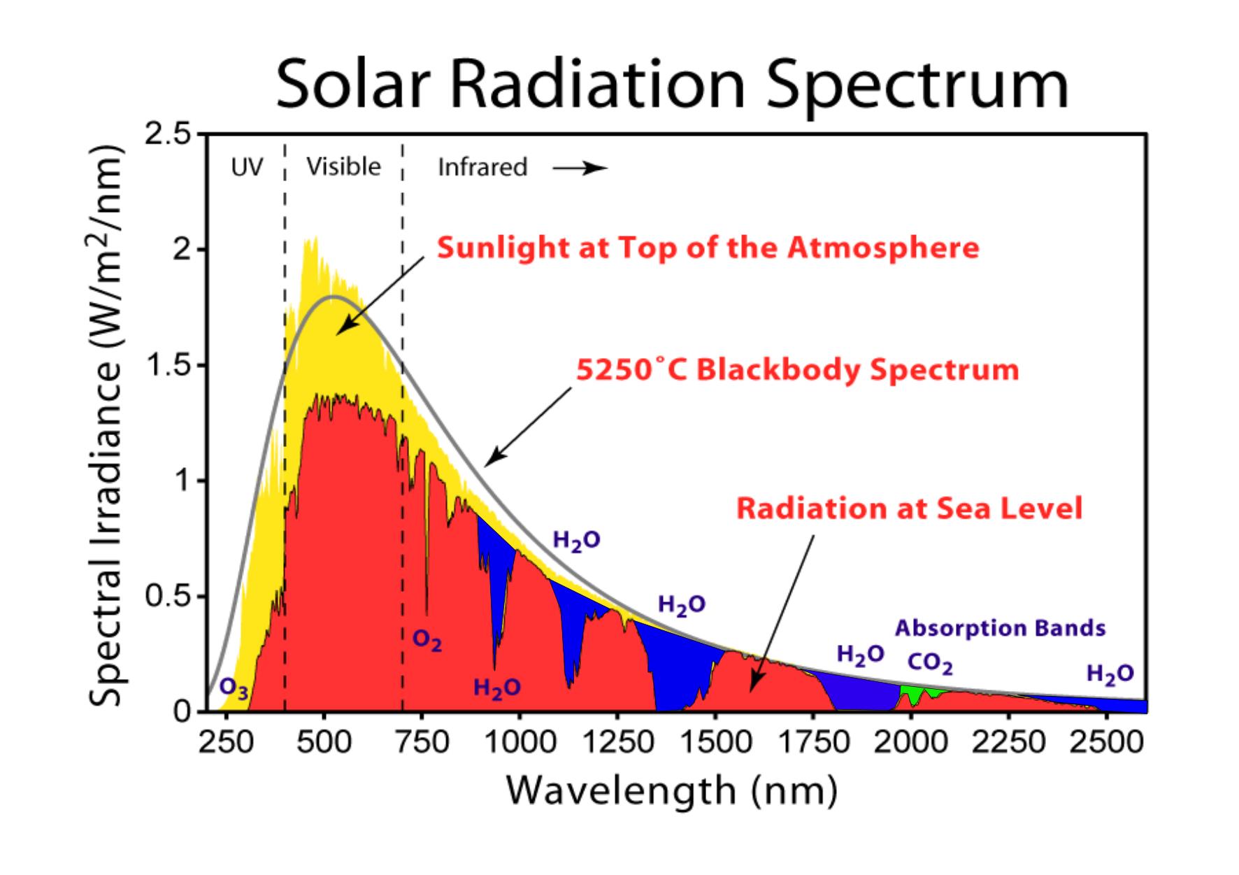 We colored this Wikipedia image blue in the water shortwave absorption bands a while back. Oxygen, particularly in transition to ozone is a significant absorber in the SW solar spectrum. We will see when we get to MODTRAN that there is significant ozone formation near the surface as well as the stratosphere. CO2 absorption in the SW spectrum is limited to small areas near 2000 nm, shown green.