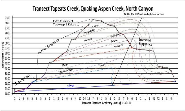 We are unaware of any published transects approximating ours, and offer here a reasonable hypothesis accounting for the data. The Butte Fault, which separates the Neoproterozoic Supergroup members from the river, transitions to the East Kaibab Monocline, which our transect crosses nearly perpendicular.