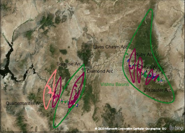 Well, there you have it. A fanciful attempt to reconstruct geography 200 million years before eukaryotic (with a nucleus) cells evolved. Our most serious suggestion is that the distribution of Vishnu suggests two uplifts that dictate the “W” of the Grand Canyon may be ancient basins.