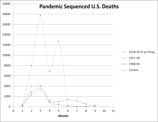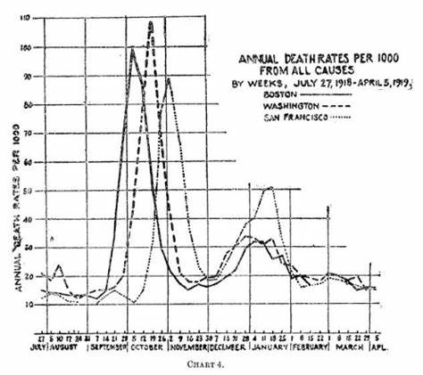 We have shown above only the second and third peaks of the widely circulated triple whammy from England shown above. US data for the first wave is dismal. A handful of deaths at an army base and nearby towns. The CDC offers this curve as anecdotal without axis data.There is an interesting paper (Olsen et al 2005) arguing for a US beginning in New York as early as 1916.