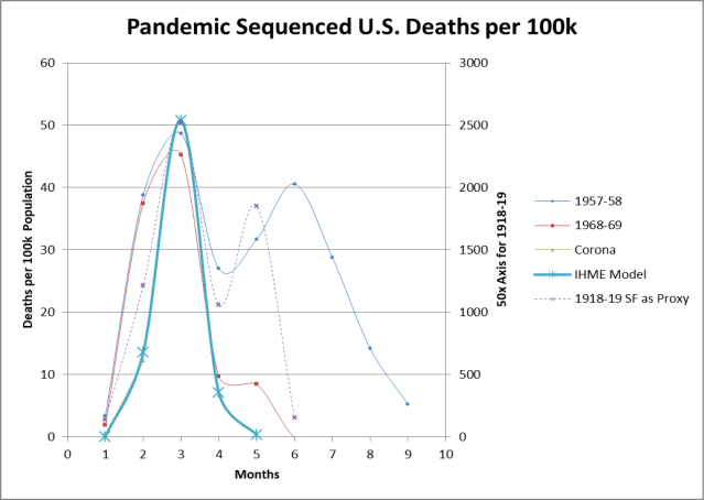 We now feel trying to force everything to actual deaths for influenza only was an error that distorts the true historical perspective, so we make this addendum April 12. Below we have converted everything to deaths per capita and added the IHME model in monthly bins.