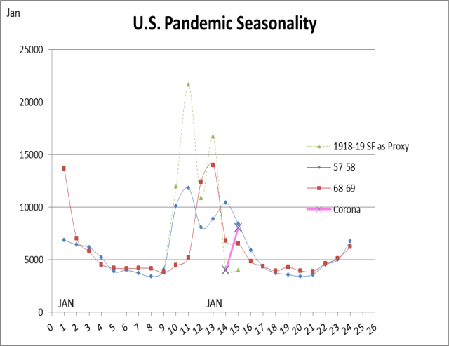 These deaths are not adjusted per capita, as that has no effect on seasonality and separates the curves. Clearly, prior pandemic deaths are strongly seasonal. The 1967-68 year looks like it may have been pretty bad. Unfortunately, CDC has no monthly data except for 68-69.
