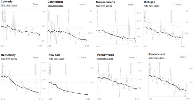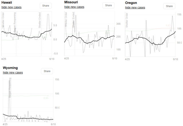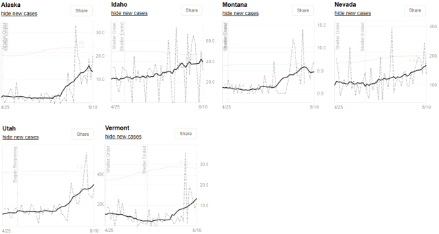 - Utah has had steady Rt>1 for the entire period. A month elapesd before there was appreciable increase in cases, and it experienced a striking rise without any increase in Rt.