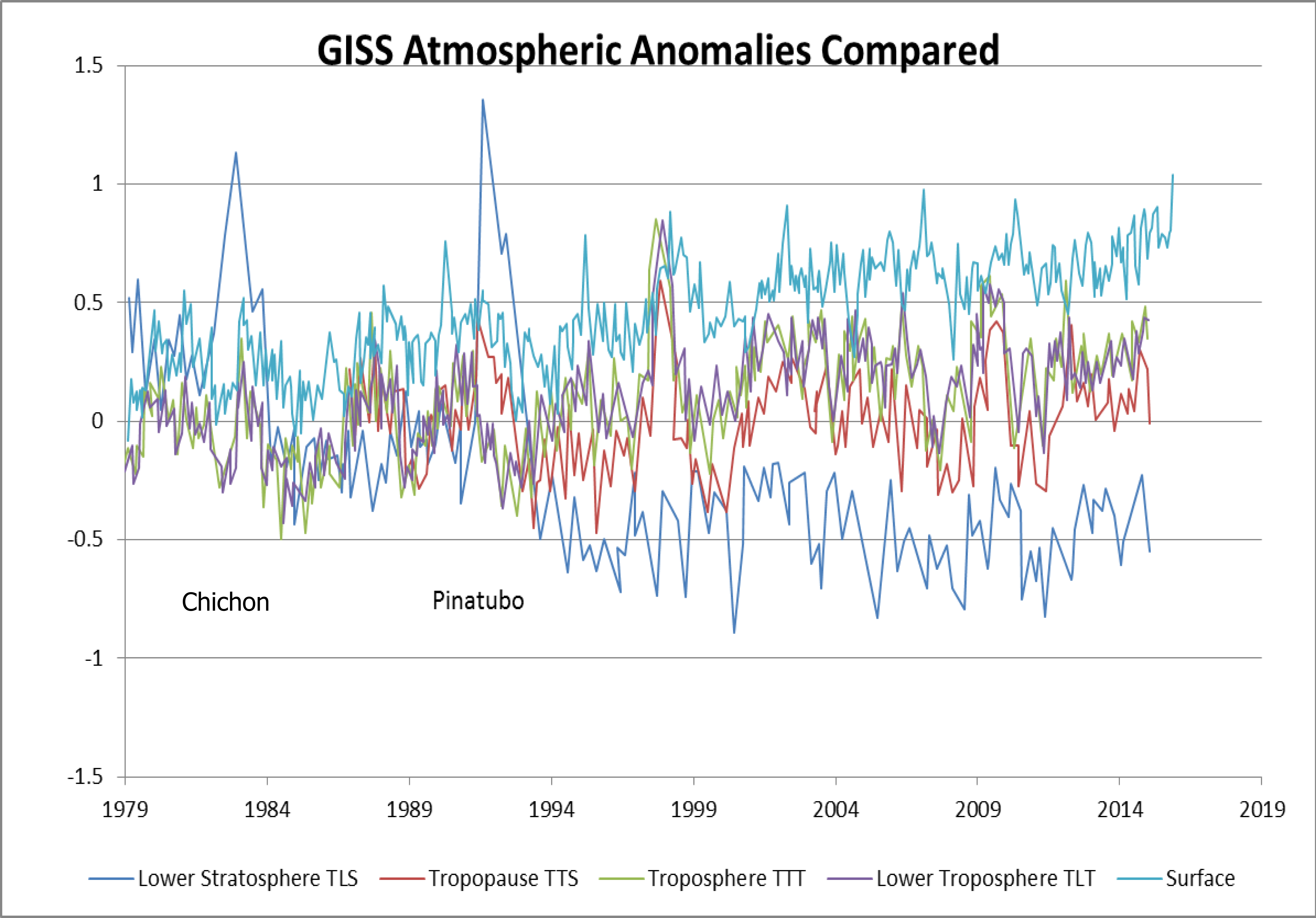 Everybody knows it gets colder when you go up in altitude. The reason for this is that the surface is the primary heat source for the atmosphere. In the regions where the atmosphere cools quickly with altitude (the troposphere) the temperature series’ trended higher quickly from the beginning of the record in 1979 to about the millennium, and thereafter slowed way down or stopped increasing. In the lower stratosphere where the lapse rate goes to zero and begins warming again due to ozone the series does the opposite, declining during the period before the millennium and then flattening out.