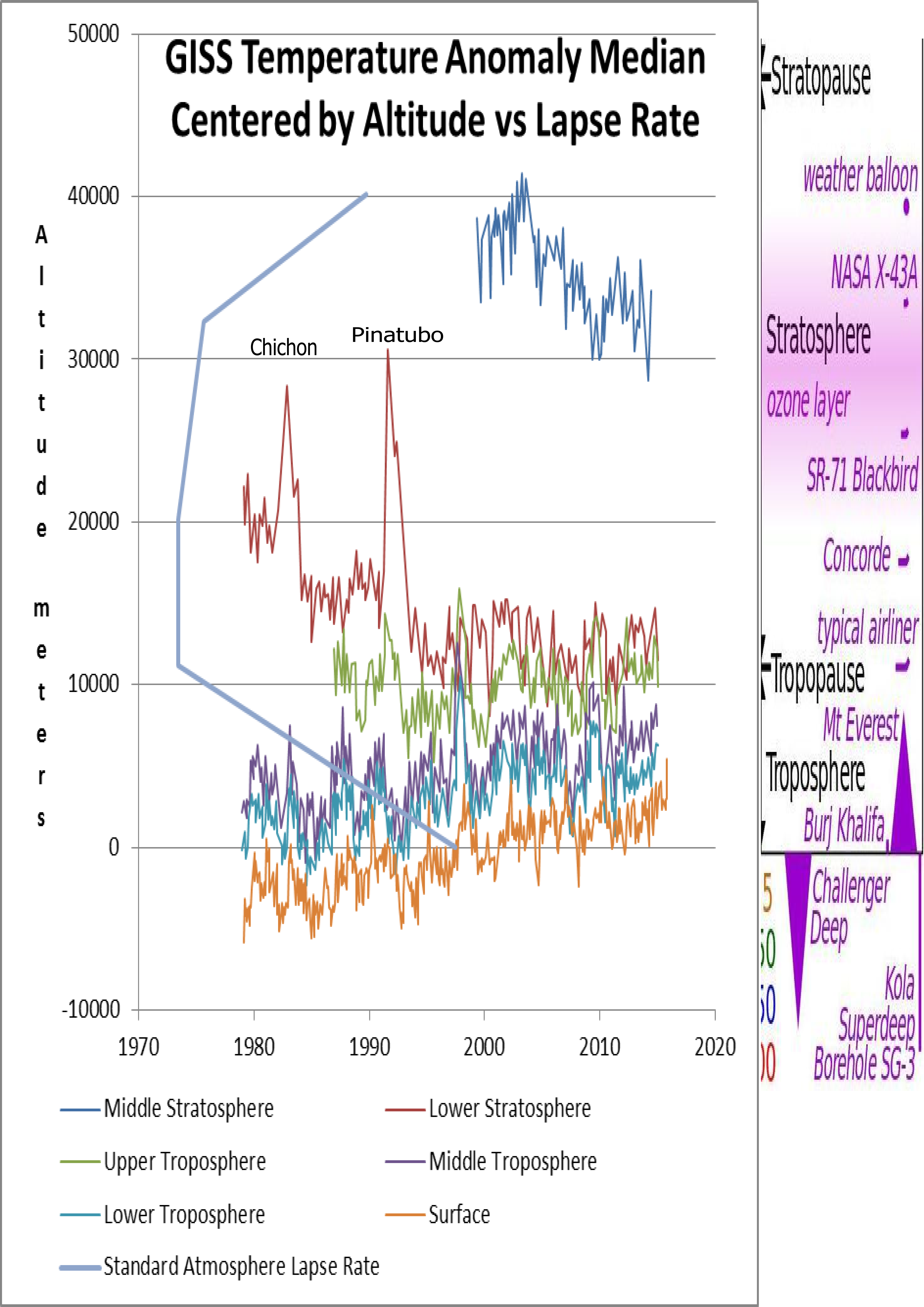 In the Graphic above the various altitude temperature series are scaled with the middle of the range at their appropriate altitudes to allow a rough comparison with the lapse rate of the atmosphere. The lapse rate was scaled to fall amongst the profiles. A shorter series from the middle stratosphere is added and it seems to be cooling sharply.