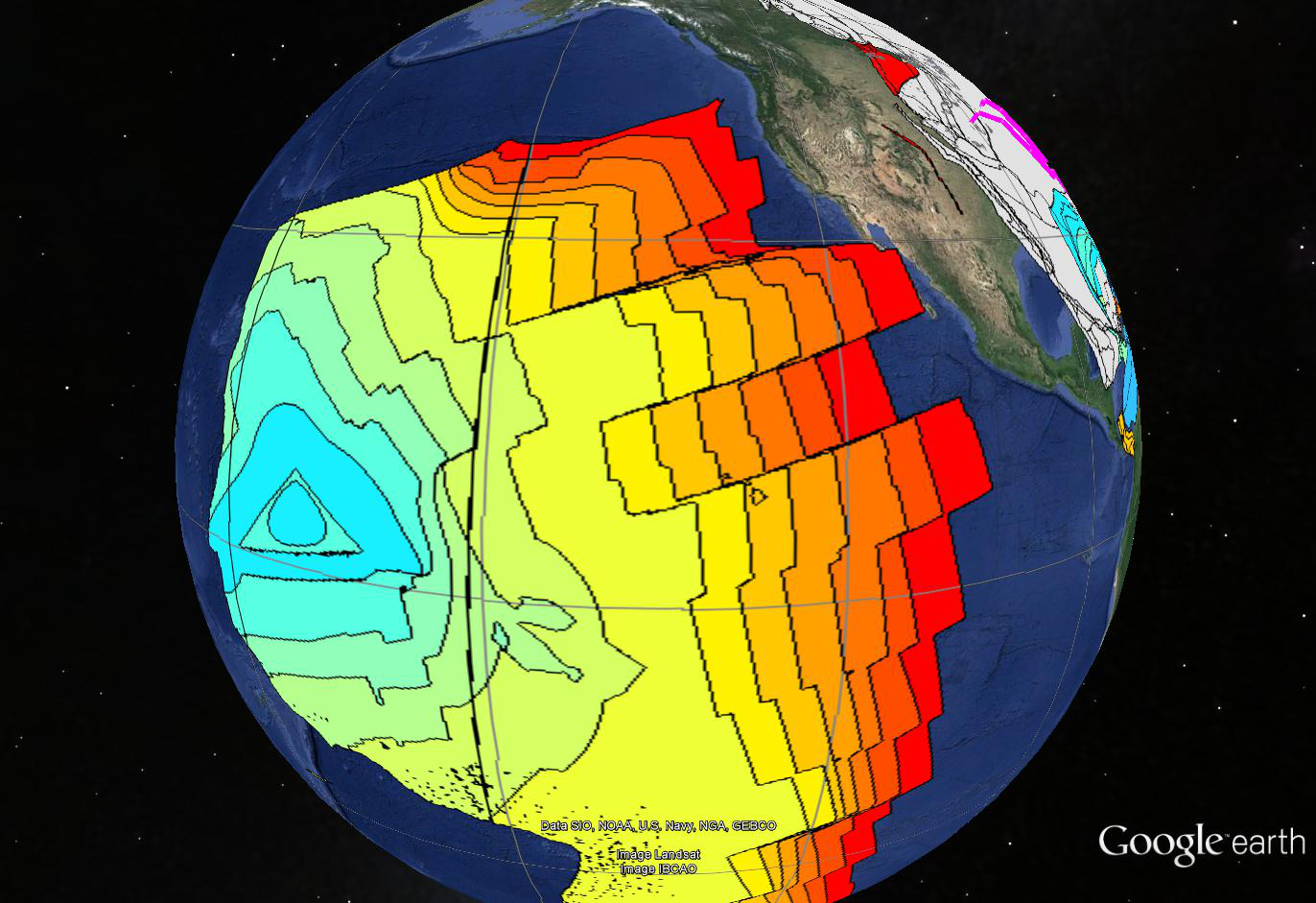 This Google Earth image shows how far the ridge had migrated from the Triangle and how much it had advanced on the current North America as of 60 million years ago(mya). It is important to remember that wherever you can see our current world in this image, there was only ocean floor 60 mya. We presume that the ridge was producing symmetrically so that there would have been a complimentary pattern of isochrons to the right (east) of the ridge, but all that ocean floor has been lost as has most of the floor west of the Triangle. There seems every indication from what little is preserved that the other two legs were producing as much floor and moving away at the same speed as the Pacific Rise.