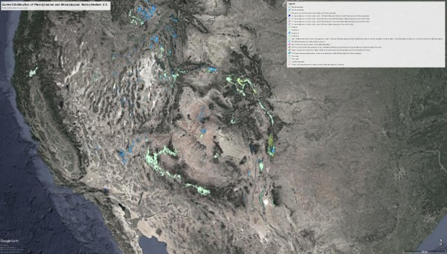 Above is the current distribution of Pennsylvanian (lower Supai) and Mississippian (Redwall) surface rocks in the western United States. These are broad categories chosen by individual State Geologists, and some Permian rocks are included, but it can be seen that shallow ocean covered large areas. These are all sedimentary rocks except some minor volcanics in central Nevada. These volcanics and the folding at the bottom of the Redwall are probably related to the Antler overthrust in Nevada where sediments were pushed over what was then a continental shelf.