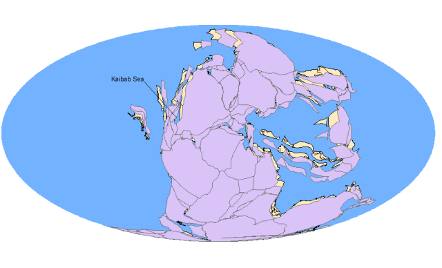 Above is the configuration 260mya during the formation of the Kaibab Limestone that forms the rim of the Grand Canyon. The 250mya continents remain in tan beneath and it can be seen that Pangea tightened up and rotated as we progress backward in time. The Kiabab was very much an inland sea, and as the river cuts quickly through the upwarp visible in the first photo, the Toroweap formation beneath the Kaibab formed in an arid inland lake like the current Great Salt Lake. By mile 4 the river has already cut to the underlying Coconino sandstone, laid down as vast dunes like the current Sahara Desert covered large areas of western North America. You may have guessed that the Coconino and Kaibab are separated by an unconformity.