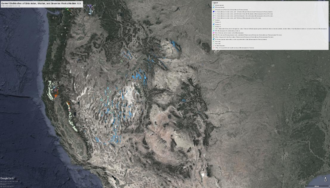 Above we show the current surface rocks deposited during the time between the Muav and Redwall in the western US. There seems to have been a broad seaway to the west in Idaho, Utah, Nevada, and California. Not just the Grand Canyon, but the entire Colorado Plateau seems to have missed out on deposition during this time. Perhaps it was elevated like it is today.