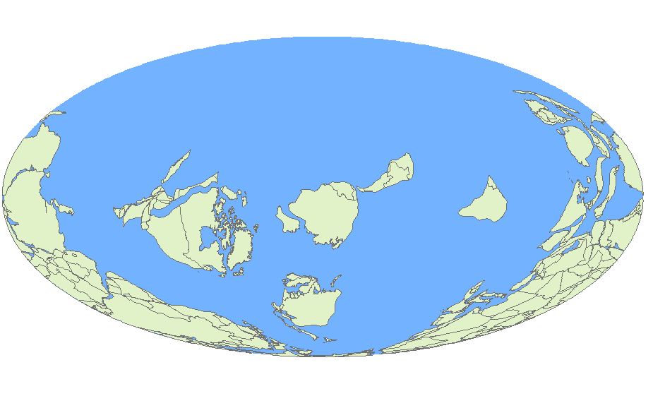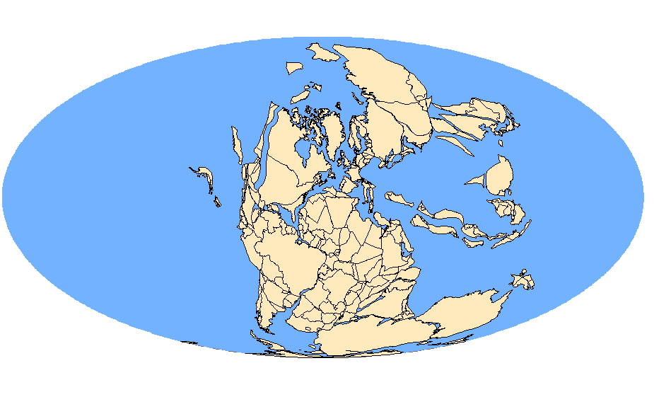 Above is the configuration of continents 250 million years ago at the Mesozoic/Paleozoic boundary according to Christopher Scotese’s Paleomap Project. The supercontinent Pangea was beginning to break up, and a seaway had formed between North America and Africa.
