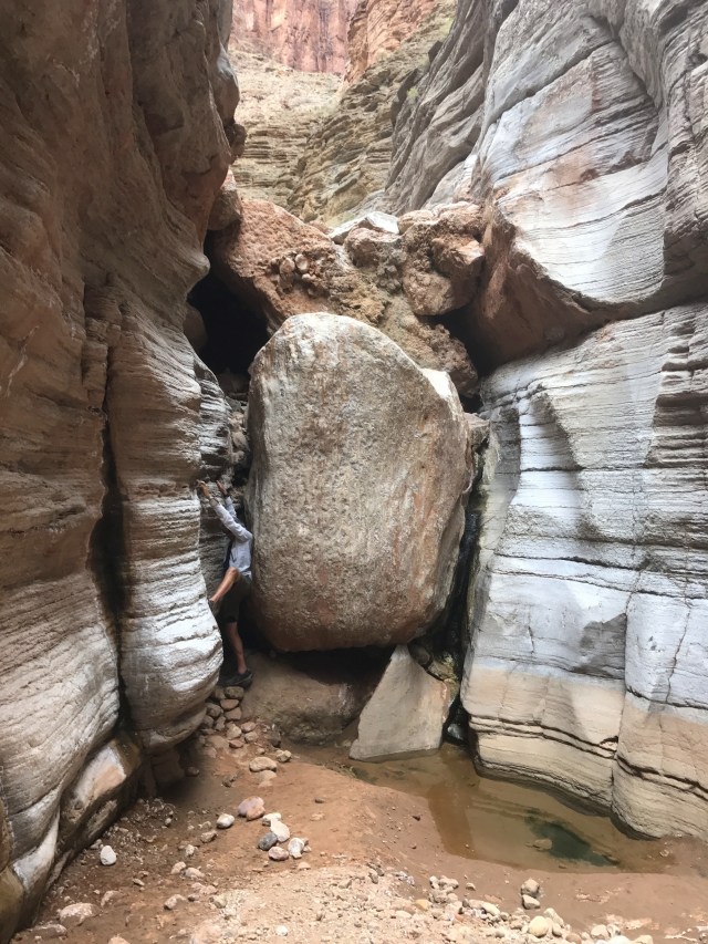 A boat trip down the Grand Canyon begins a few miles below Glen Canyon Dam and Lake Powell, at a place called Lee’s Ferry. Faulting has resulted in the canyon being eroded back here, allowing access by road. The next road access is 226 miles downstream. The red formation in the middle background is the Moenkopi formation, deposited above sea level in a low energy delta and braided stream setting. Moenkopi is of earliest Mesozoic age, the age of dinosaurs, but dinosaurs had not yet evolved. Tracks of Therapsids, the reptilian branch that would eventually lead to mammals can be found in the Moenkopi mud. Below Lee’s Ferry, you bid farewell to the Mesozoic, and enter a realm where older Paleozoic rocks form the canyon rim.