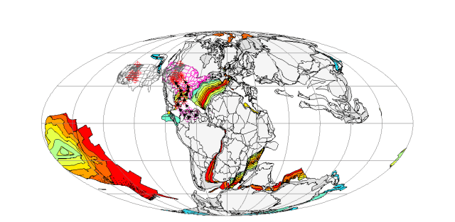 The image above shows the points chosen to begin with at 250mya. Also shown are projected rasters from Ron Blakey showing substantial agreement.