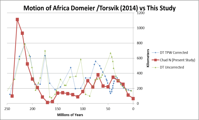The blue and green curves above are the true polar wander corrected and not corrected rates after Domeier and Torsvik, respectively, for the period we consider here. The red curve is northern Chad from this study.