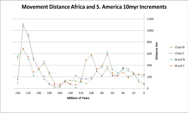 Above are the motion rates for Africa and South America. The two continents are geographically “keyed” together such that differential motion that does not result in separation would result in shear and compression for which there is no evidence. We conclude that the early more rapid northward movement of Africa resulted in a separation zone, perhaps a rift valley, that accommodated subsequent differential motion long before the Atlantic ridge began their official separation.